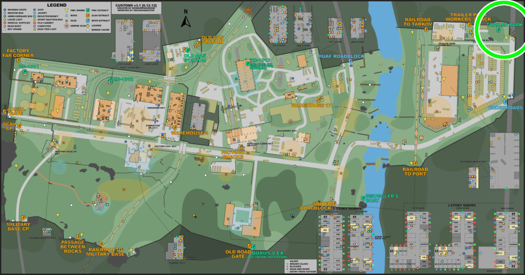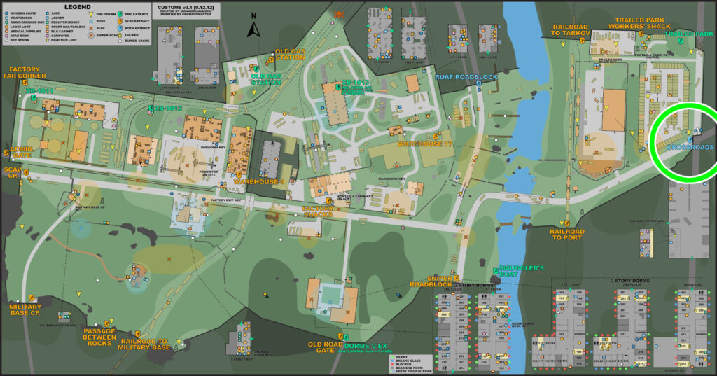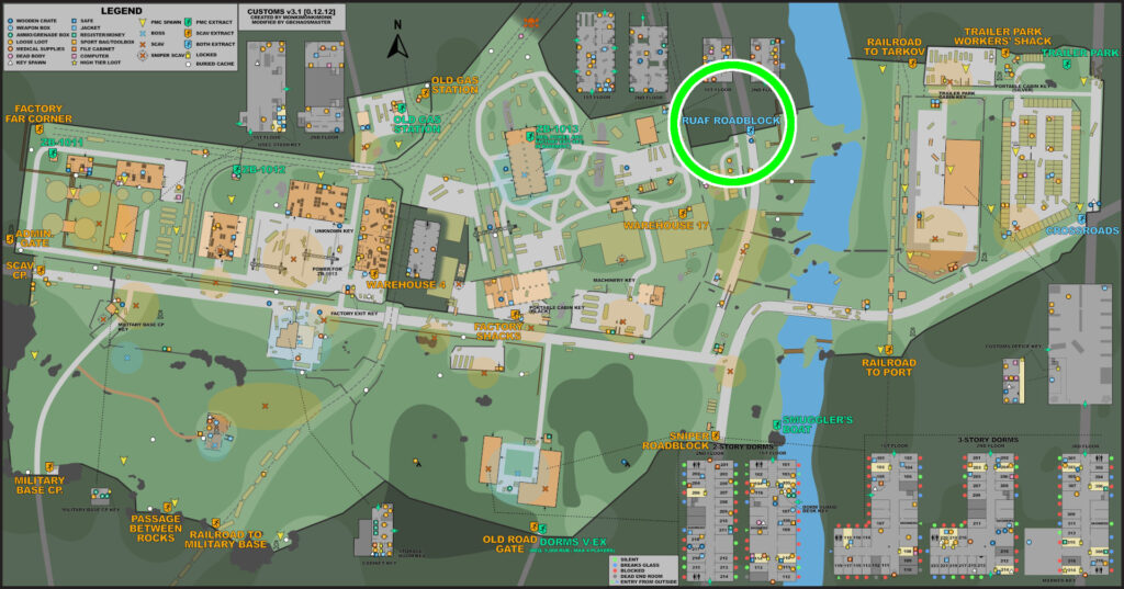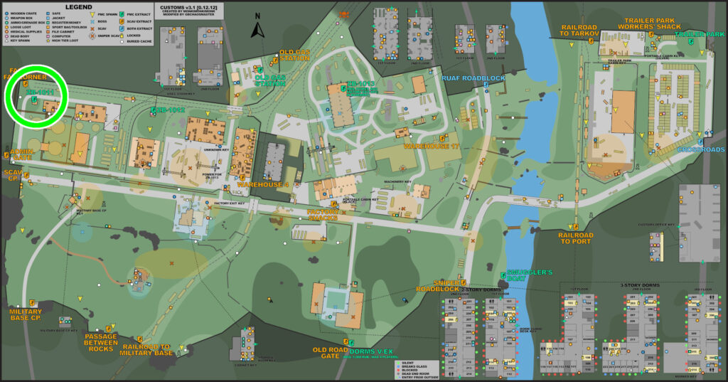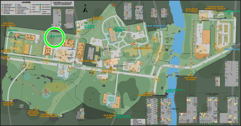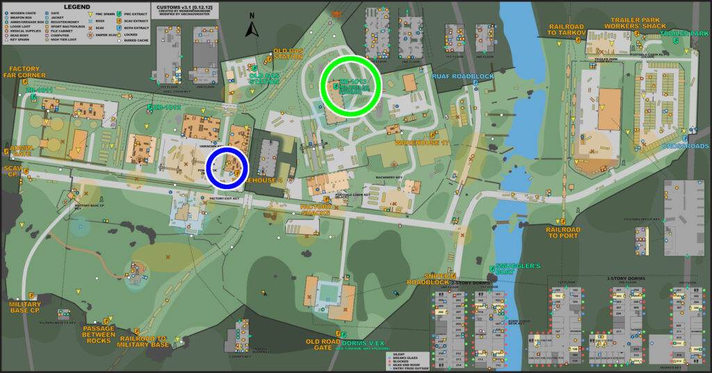 二階建て+地下の建物で、全体的にアイテムが配置されており、箱も複数置いてある美味しい場所。地下には脱出口「ZB-13」がある。この脱出は条件があり、電源が入っている事と、「factoryExitKey」を所持している事 この脱出口は確定で脱出一覧に表示され、どの位置で沸いても脱出することが出来る。だから誰も居ないからとゆっくりしていると、脱出しに来た高レベルプレイヤーと戦闘になったりするので漁るなら手早く。 そして、ここにはcustomsボスのリシャーラの沸きも設定されていて、彼らは遠距離から正確に当ててくるAIMで高級弾薬を惜しみなく撃ってくるので序盤の装備で討伐するのはとても厳しいです。