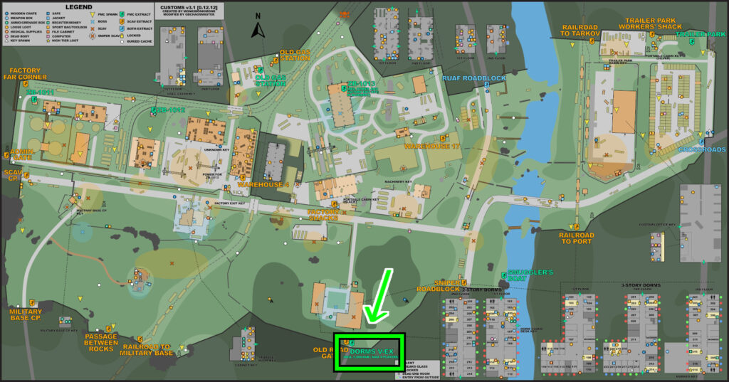 三階建ての寮の三階には、各種色付きカードやレアな武器等がスポーンする部屋があり、マークドキーを持っている幸運、かつ腕に自信があるプレイヤーが訪れます。また、マークド部屋以外にも、金庫やPCケース、スポーツバッグ等が置いてあり、漁ることが出来ればとても美味しい場所です。これまでと比べてマークドキーの価値が上昇した為、訪れる人が減っている印象がありますが、寮内でPMCキルタスク等あるため、集まる人は高レベルプレイヤーが依然として多いです。そして、新建築と同じくボス集団のリシャーラが沸きます。